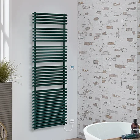 Der 2-reihige, asymmetrische Badwärmer mit den durchströmten, horizontalen Rohrpaketen, die an den freien Enden radial zusammengeführt sind. Elegantes Überstreifen der Handtücher mit einer Hand.…