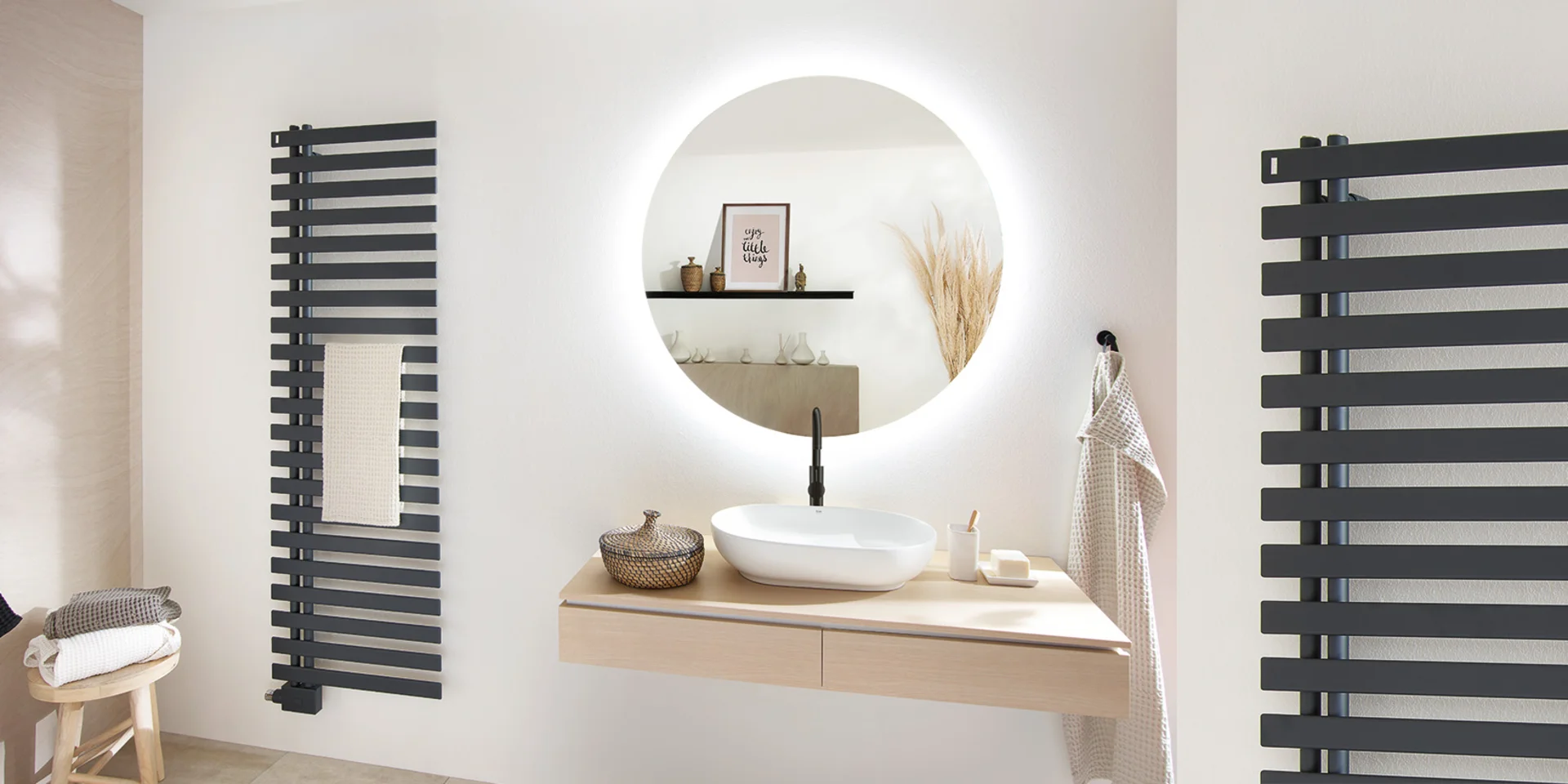 Der asymmetrische Badwärmer mit dem trendigen, planen Design.