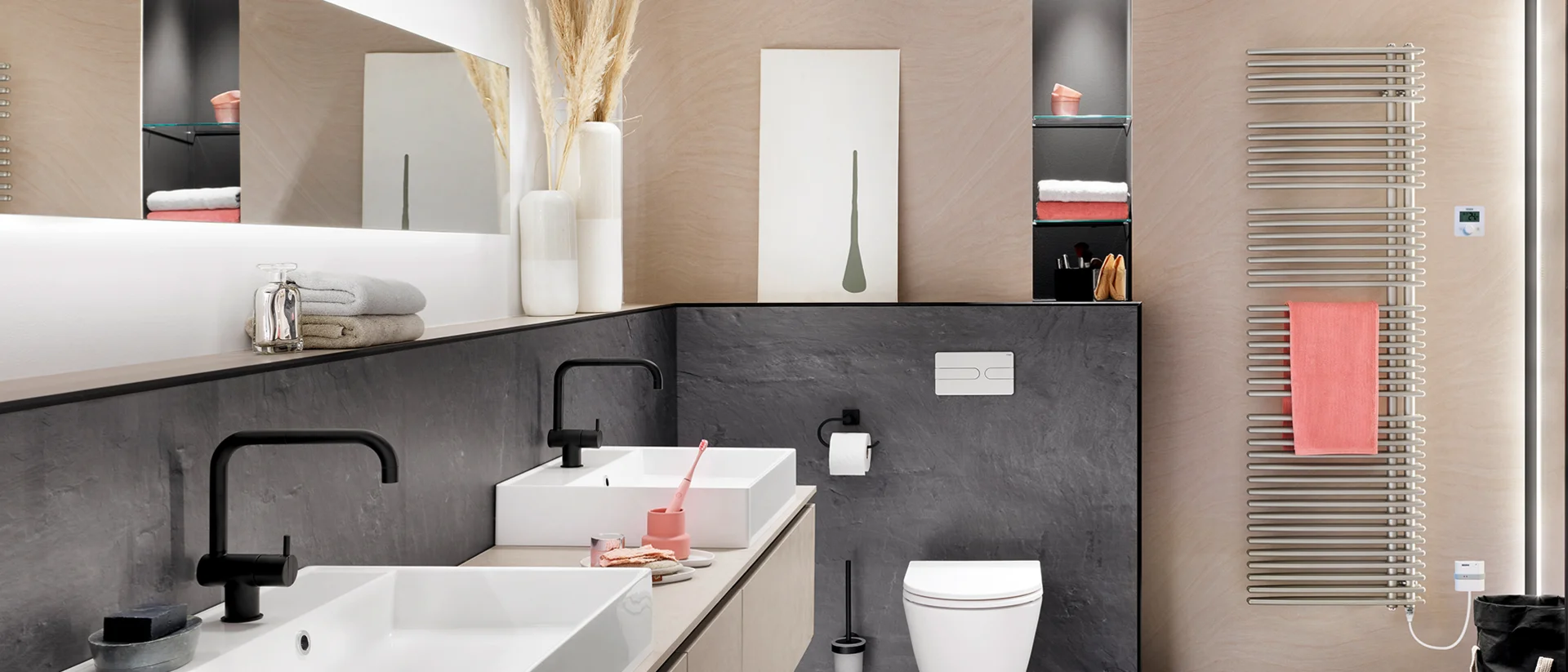 Der 2-reihige, asymmetrische Badwärmer mit den durchströmten, horizontalen Rohrpaketen, die an den freien Enden radial zusammengeführt sind. Elegantes Überstreifen der Handtücher mit einer Hand.