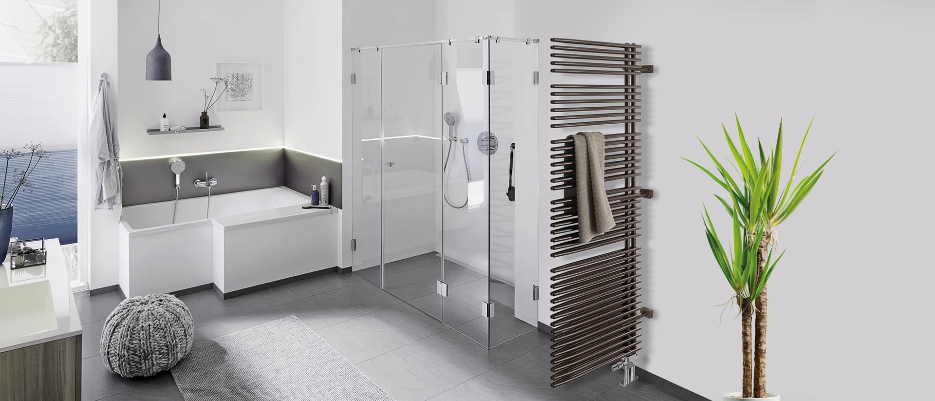 Der 2-reihige, asymmetrische Badwärmer mit den durchströmten, horizontalen Rohrpaketen, die an den freien Enden radial zusammengeführt sind. Elegantes Überstreifen der Handtücher mit einer Hand.