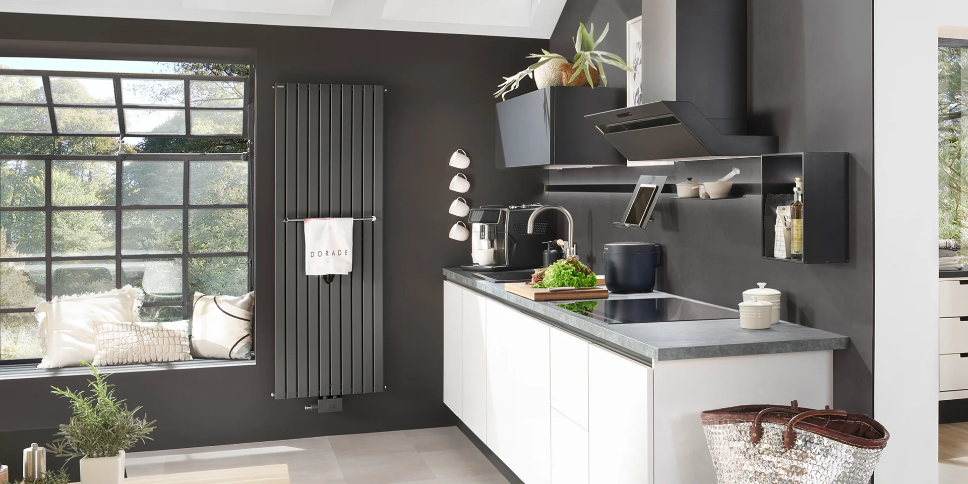 Die vor und hinter den Sammelrohren positionierten abgerundeten Flachpaneelrohre ergeben ein ebenmäßiges Design. Aufgelockert durch die feinen Schlitze zwischen den Rohren.
